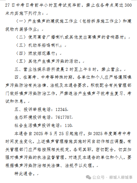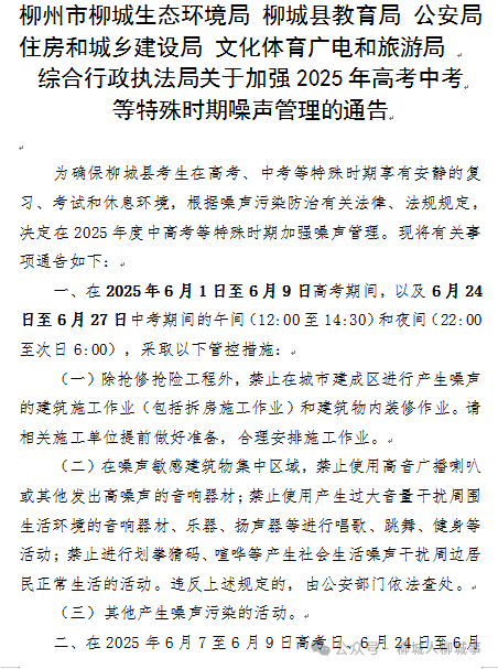 柳州市柳城生态环境局等部门联合发布了关于加强2025年高考中考等特殊时期噪声管理的通告,采取强制措施在规定时段内禁止进行产生噪音污染的施工作业、娱乐活动等。一经发现,群众可对考试期间产生的环境噪声污染和扰民活动进行监督和举报。
