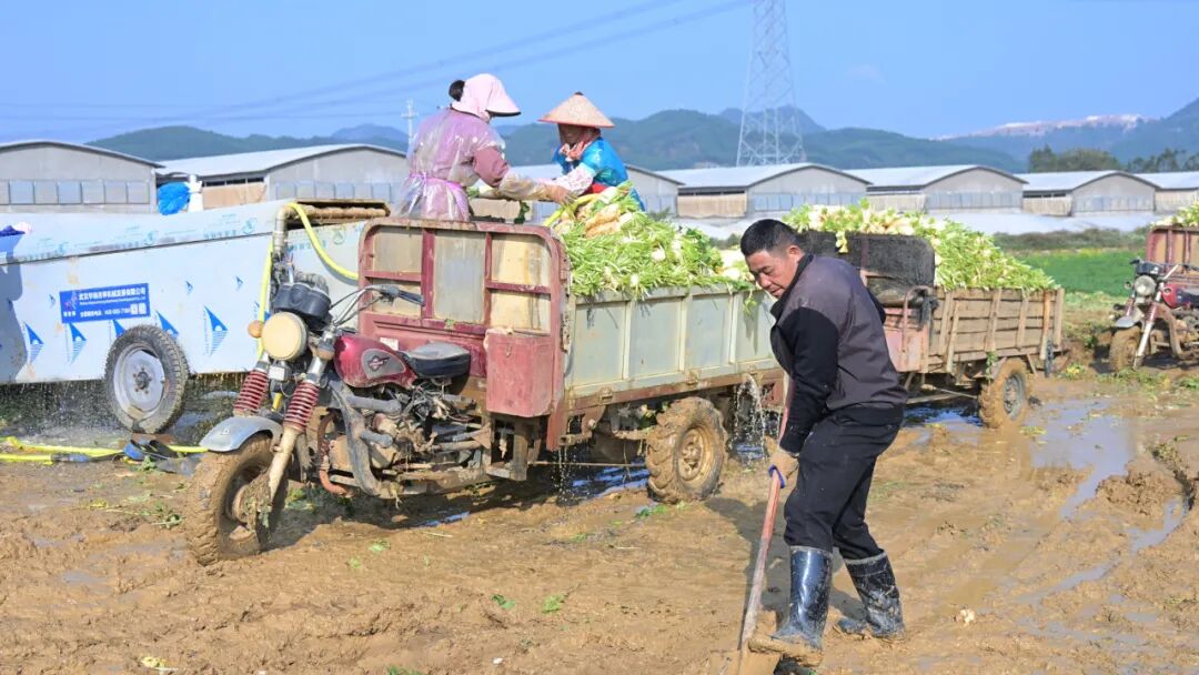 丰收的喜悦之余,采摘和销售的忙碌也随之而来。为了及时将新鲜萝卜运往市场,杨吉雄特意请了20 名工人,每天忙着拔萝卜、清洗、打包。工人们分工明确、干劲十足,田间地头一派热火朝天的劳作景象。“工人每天工资 200-300 块,虽然增加了成本,但能保证萝卜新鲜上市,再辛苦也值得。” 杨吉雄在现场,还帮忙运输萝卜到指定的位置清洗。