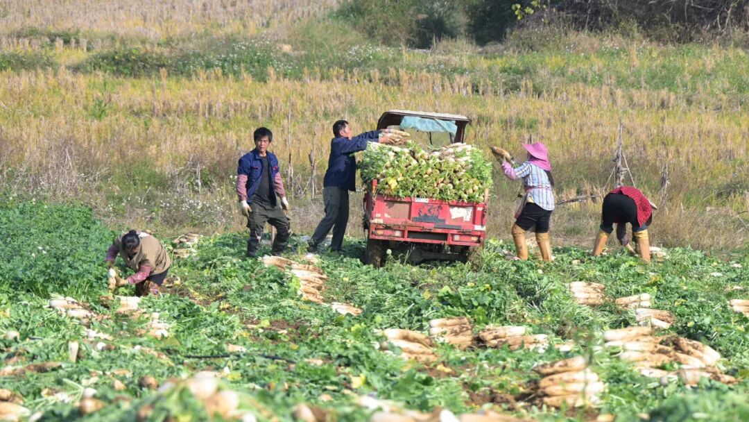 12月,柳城县马山镇四塘农场三队的田野里一派繁忙景象。460 多亩白萝卜田郁郁葱葱,翠绿的菜叶下,一个个饱满雪白的萝卜破土而出,预示着今年的大丰收。眼下正是采收旺季,种植户杨吉雄忙着采收。