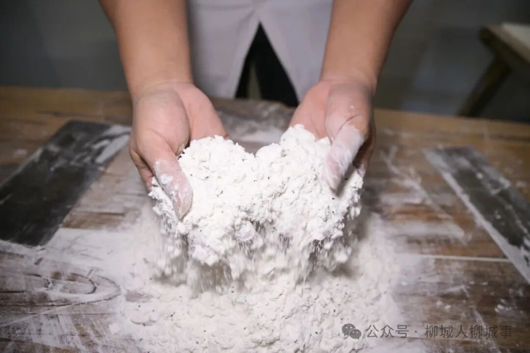 制作的精妙,全在“裹”与“压”之间。他先将糯米粉在案台堆成“窝状”,然后让稠如酸奶的糖油顺着勺沿拉丝流入米粉堆,双手呈弧形翻拌,让米粉与糖油裹成棉絮般的团状。