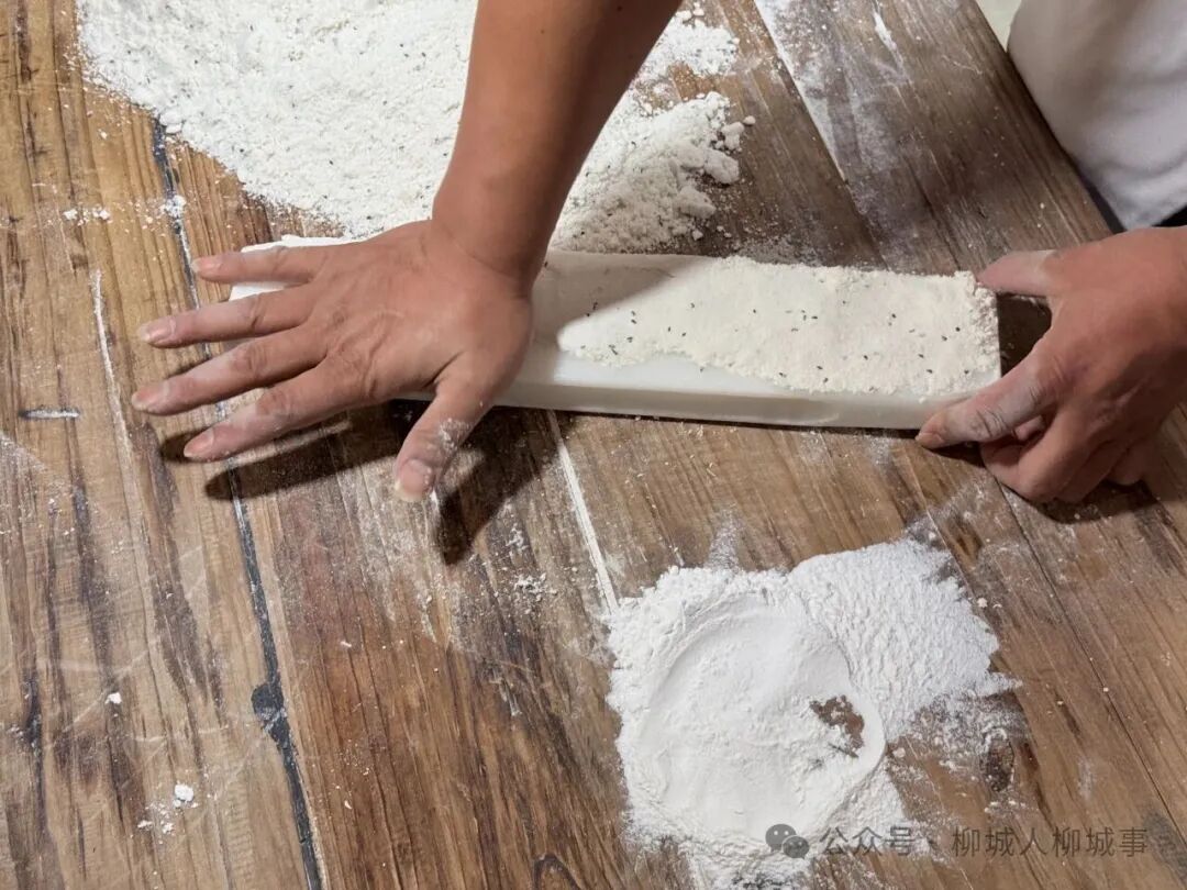 翻拌的过程中,廖荷辉拿起两把灰铁刮板,对着粉团反复切压,黑芝麻便均匀嵌进米粉里。“力道轻得像给小孩拍背似的。”他手腕转动间,粉团已泛出芝麻斑点,“要是使劲揉,米粉起了筋,米饼咬着就发死,没那股松软劲儿了。”廖荷辉说,他这手“轻压慢拌”的功夫,是跟着母亲学手艺时最磨人的一课。“那时候我总急着出活,母亲就拿木棰敲我手背:‘米饼是吃香的,不是吃力气的’。”