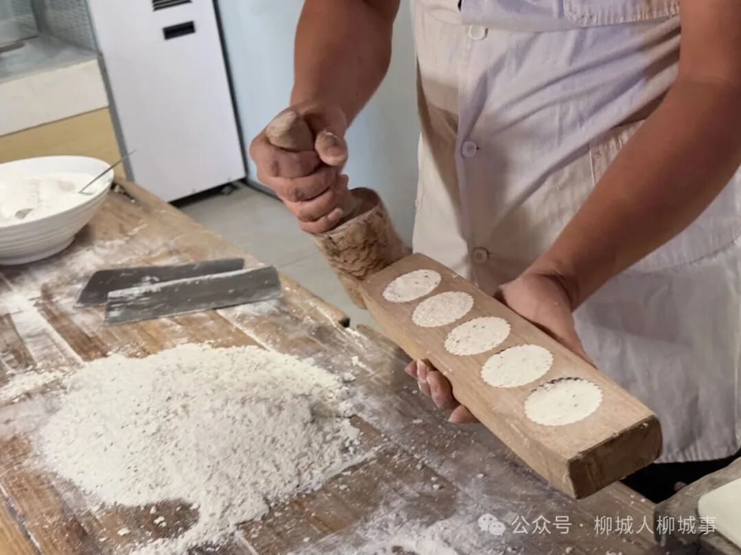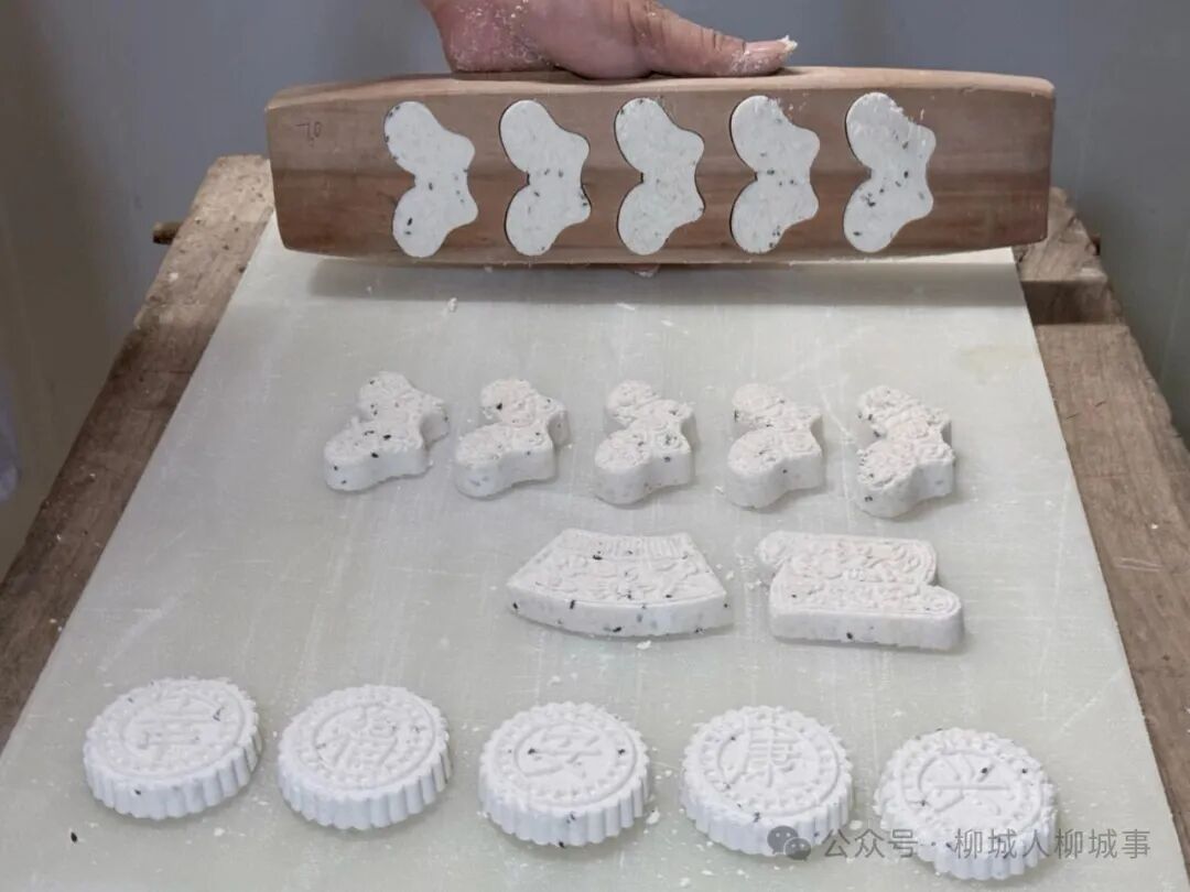 最见功夫的是压模。饼模登场时,廖荷辉的动作多了几分郑重。他将粉团填入刻着“喜”“财”“兴”“福”等字样的模子,用掌心轻扣模面压实,再抓起木棰对着模子“咚”地一敲——带着清晰字纹的米饼应声落在案板上。