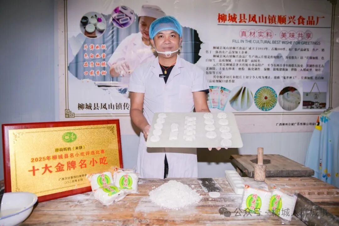 柳城县凤山镇顺兴食品厂的木案台上,一捧雪白的糯米粉堆成小丘,廖荷辉指尖轻捻,将炒香的黑芝麻均匀撒在米粉的中央——这是“柳城十大金牌名小吃”米饼的第一步,也是柳城人记忆里最熟悉的甜香开端。作为柳州市级非遗传承人,廖荷辉把家族几代人的手艺,揉进了一枚小小的米饼里。