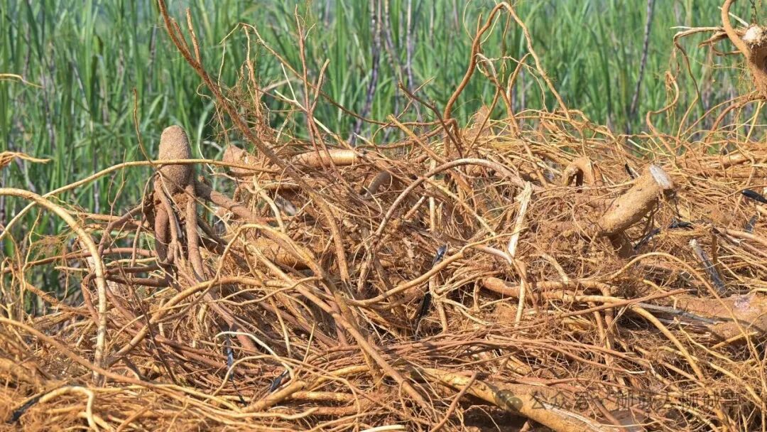 柳城县寨隆镇更祥村龙珠屯的田间地头,一派繁忙丰收的景象。大片五指毛桃地里,挖掘机轰鸣作业,铁铲深入土层稳稳挖出带着泥土芬芳的根茎;一旁的工人们手持锯子,熟练地将五指毛桃根茎锯断、整理,再快速打包成捆,整齐堆放等待转运。这是村民覃良君精心培育的产业基地,历经三年时光沉淀,如今迎来收获季。