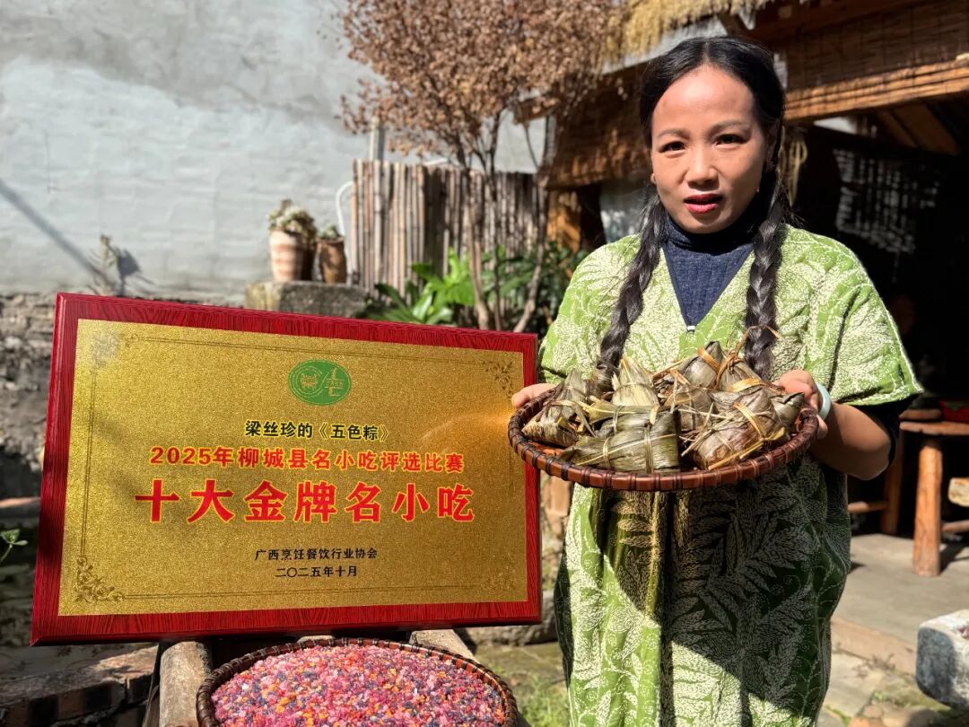 “草木染色的那种清润口感是大自然的味道,无法替代的。”梁丝珍的五色粽之所以获得“柳城十大金牌名小吃”荣誉称号,在于她坚持选用植物染色、亲手熬制染料,就连粽叶和禾秆草,也都是自己采摘或跟当地村民买来洗净晾晒的。她力求用自己的一份匠心,守住传统,也留住舌尖上的健康。