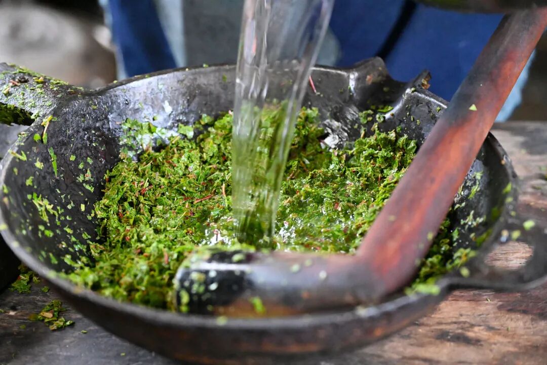 “从上山采摘植物到浸泡糯米染色,再到每种植物的用量和熬制时间、包粽子、蒸煮粽子,每一个环节都有讲究。”梁丝珍介绍,比如枫香树叶煮制黑色染料,需发酵过才能用于浸泡糯米;苏木熬制橙色染料,煮至汁液浓稠如红酒色,冷却后即可浸泡;黄饭花煮黄色染料,煮好的汁液金黄透亮,浸泡效果最佳;紫兰草(红蓝草)制紫色染料,汁液遇糯米自然呈现温润紫晕;白色则选用优质糯米,保留米香本味……