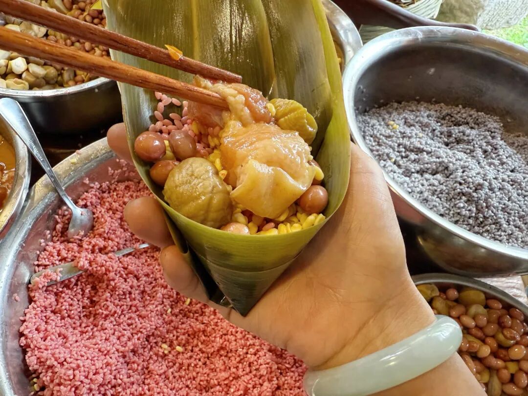 另外,包粽环节也是考验功底,她选用本地新鲜粽叶,经沸水烫软后沥干,卷成漏斗状,先是铺上一层彩色糯米,嵌入腌制好的五花肉、板栗、绿豆等馅料,然后再铺上彩色糯米,随后快速收拢粽叶,用禾秆草缠绕打结,力道需恰到好处,既要紧实不松散,又要保证煮制时香气能渗透。