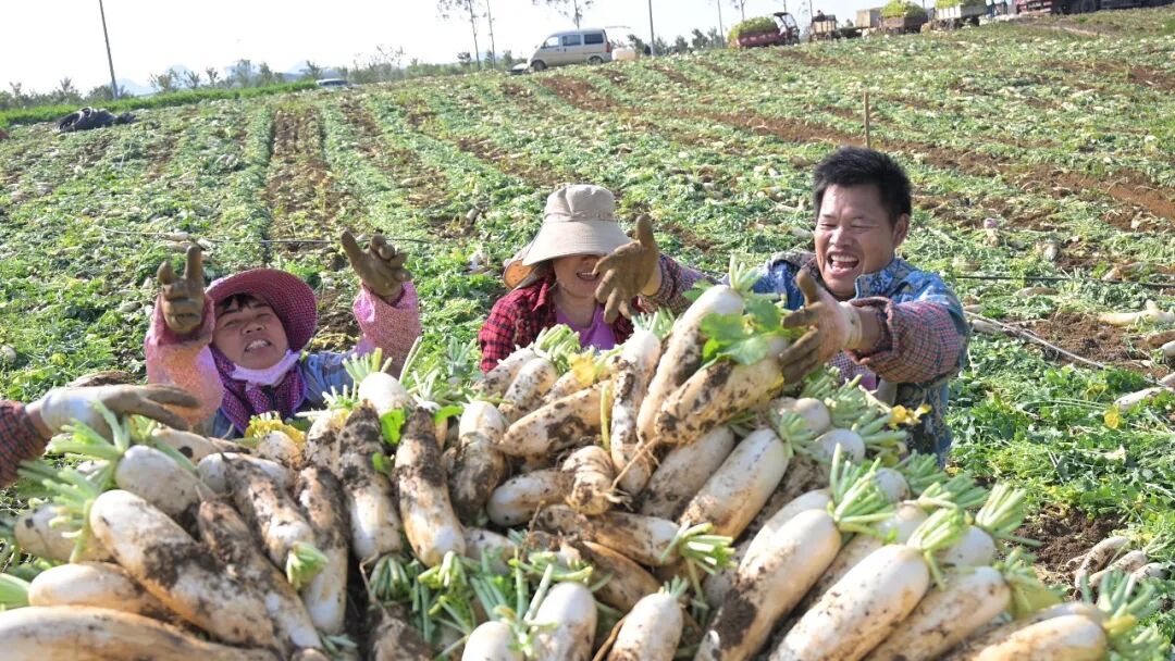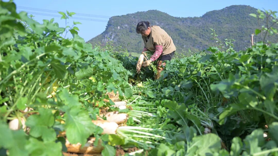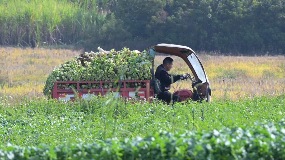 12月,柳城县马山镇四塘农场三队的田野里一派繁忙景象。460 多亩白萝卜田郁郁葱葱,翠绿的菜叶下,一个个饱满雪白的萝卜破土而出,预示着今年的大丰收。眼下正是采收旺季,种植户杨吉雄忙着采收。