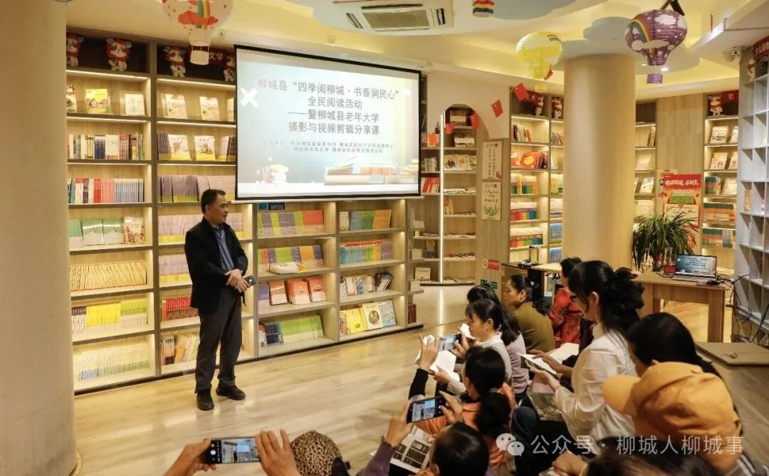 揭牌当天,新华书店内还举行了柳城县“四季阅读柳城·书香润民心”全民阅读活动——暨柳城县老年大学摄影与视频剪辑分享课。分享课紧扣群众实际需求,将实用技能培训植入阅读场景,既丰富了群众精神文化生活,也让“四季阅读”基地的文化服务功能从“静态阅览”升级为“动态互动”,充分彰显了其作为公共文化服务阵地的示范意义与实践价值,为柳城全民阅读深入开展注入新活力。