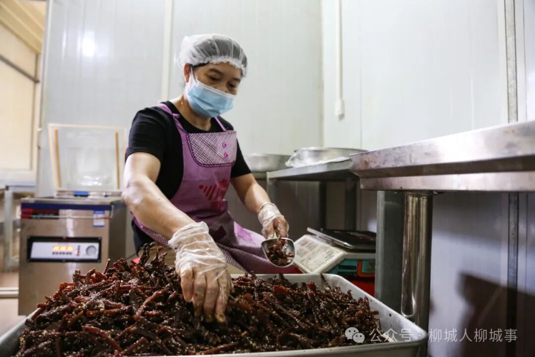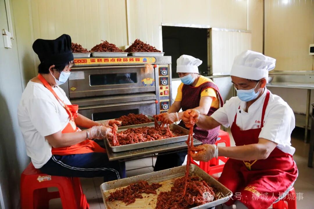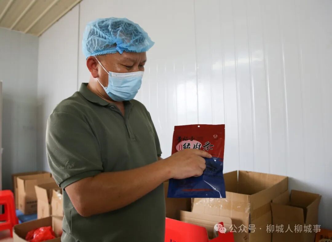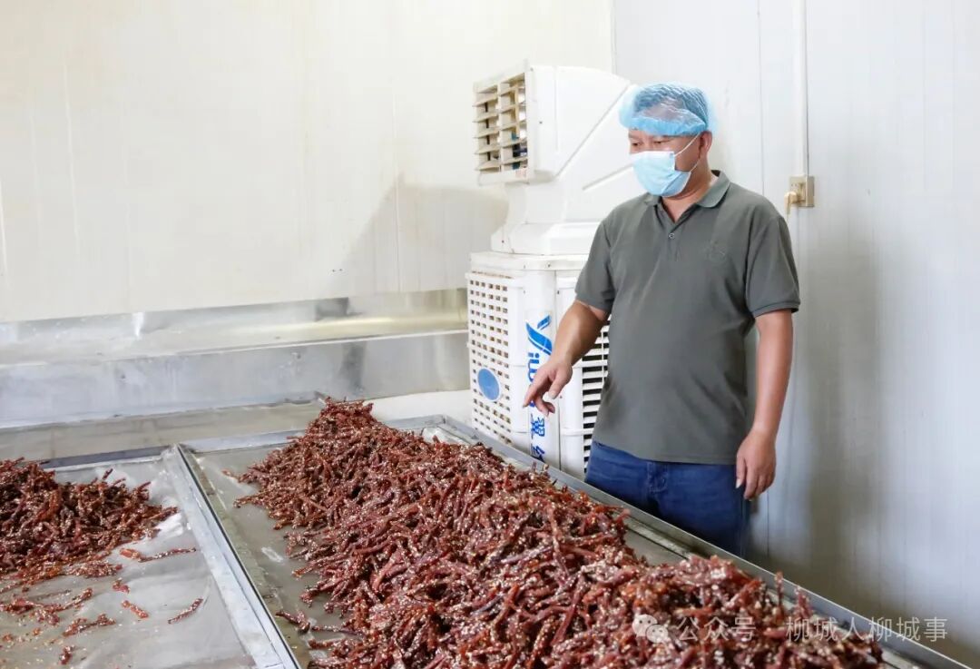 沈火强是柳城县返乡创业的人员之一。2005年,他从广东返乡回到柳城冲脉,开始做卤菜熟食生意。2021年,在六塘镇三界村委的牵线搭桥下,沈火强了解到三界村现有3栋占地面积近600平方米的厂房,便与当时的合伙人一起入股创业。“我本身做熟食生意,以前在柳州也学过做猪肉条,工艺各方面比较熟悉,看到这里有场地空闲了几年,便想着把它租下来,用来加工猪肉条。”