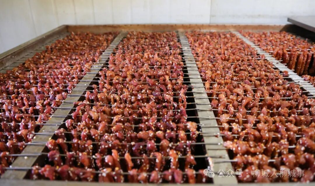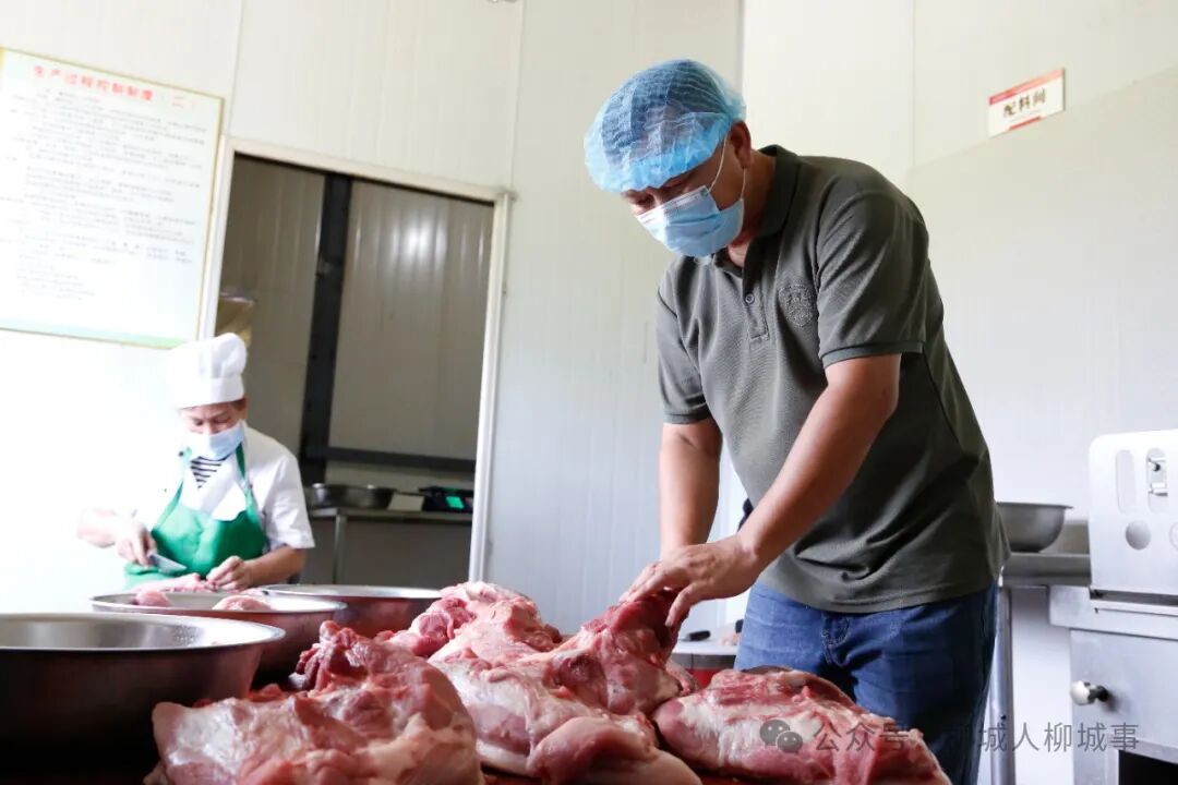 近日,小编随着负责人沈火强来到柳城县界稻香肉制品有限公司生产车间,看到几名工人正在分工合作,把当天购买的400多斤新鲜猪肉进行加工。切片、腌制、串肉、炭烤、油炸、包装……各环节有条不紊地进行。