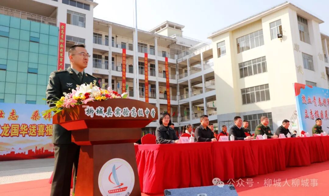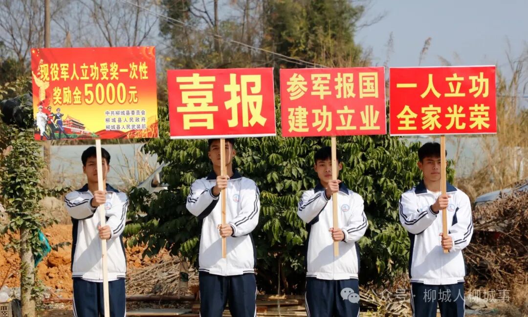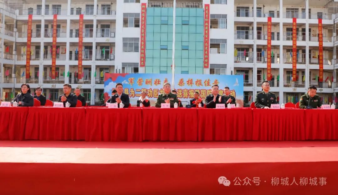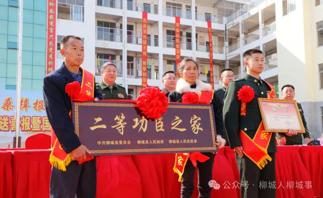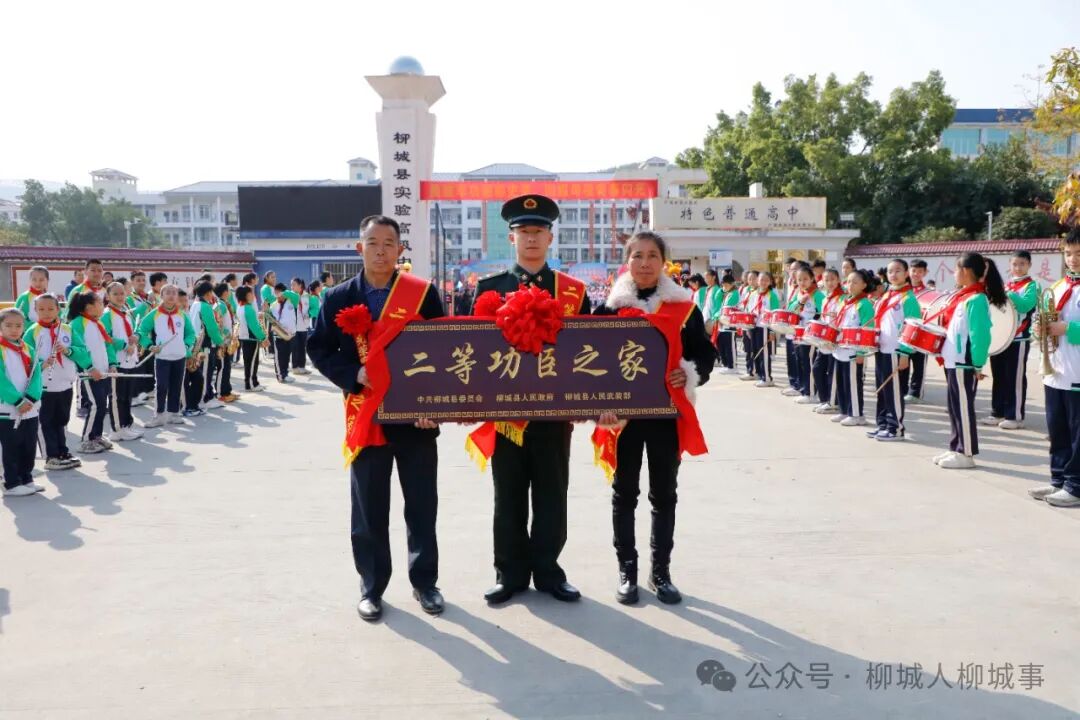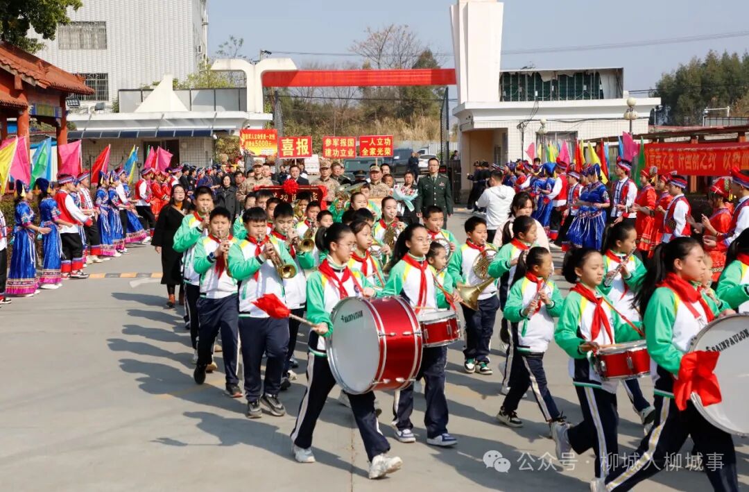 锣鼓喧天,舞狮表演热闹非凡,1月16日,柳城县在实验高级中学开展军地联合送喜报活动,为荣立二等功的现役军人龙国华及家属送去立功喜报,让军人军属共享荣耀,激励有志青年投身军旅,建功立业。