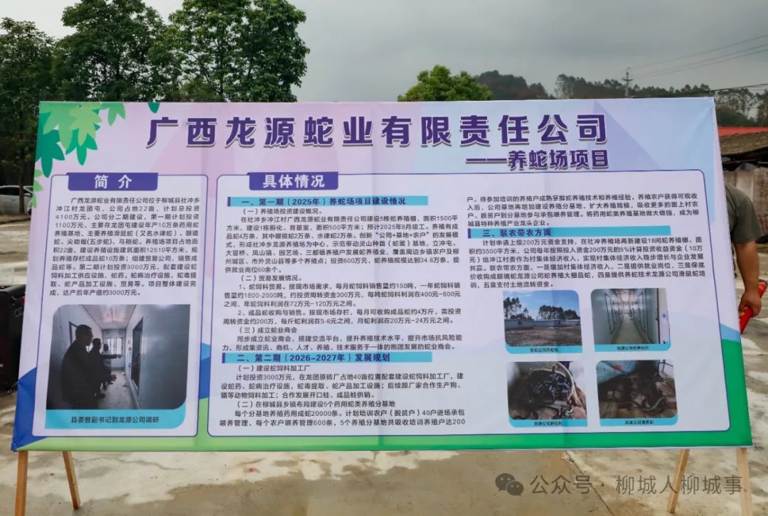 广西龙源蛇业有限责任公司养蛇场建设项目计划总投资4100万元,第一期主要建设年产10万条药用蛇养殖基地、养殖棚、育苗室等,预计8月竣工,创新“公司+基地+农户”的发展模式,带动农户养殖,第二期配套建设蛇饲料加工供应设施等。项目建成达产后,预估年产值约3000万元。