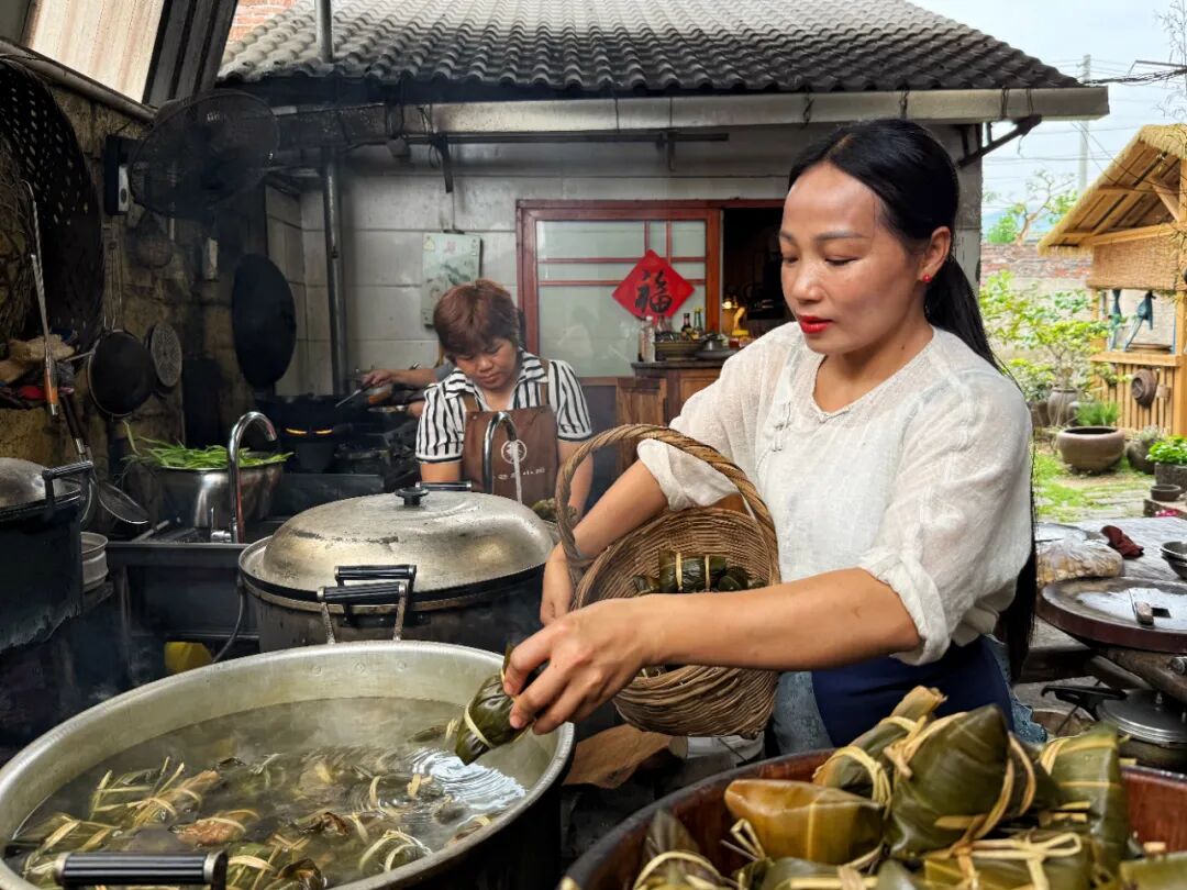 梁丝珍说,最后一道工序就是将包好的粽子放入柴火灶大锅中煮,慢火炖煮4-5小时。“柴火要保持火力,中途不能加水,这样煮出的粽子才软糯不夹生,草木香和米香才能完全融合”。