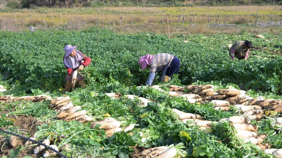 12月,柳城县马山镇四塘农场三队的田野里一派繁忙景象。460 多亩白萝卜田郁郁葱葱,翠绿的菜叶下,一个个饱满雪白的萝卜破土而出,预示着今年的大丰收。眼下正是采收旺季,种植户杨吉雄忙着采收。