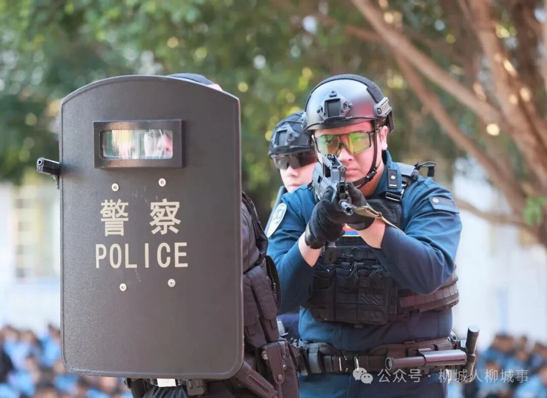 为迎接第六个中国人民警察节,1月8日,柳城县县政府办、县委政法委、公安局、检察院、法院等部门将警营“搬”进校园,通过一系列可感、可触、可参与的沉浸式体验,为师生们带来一堂生动警营体验课。