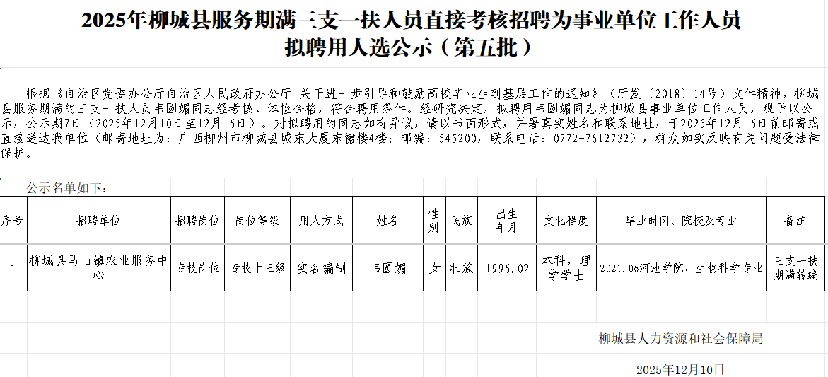 2025年柳城县服务期满三支一扶人员直接考核招聘为事业单位工作人员拟聘用人选公示(第五批)