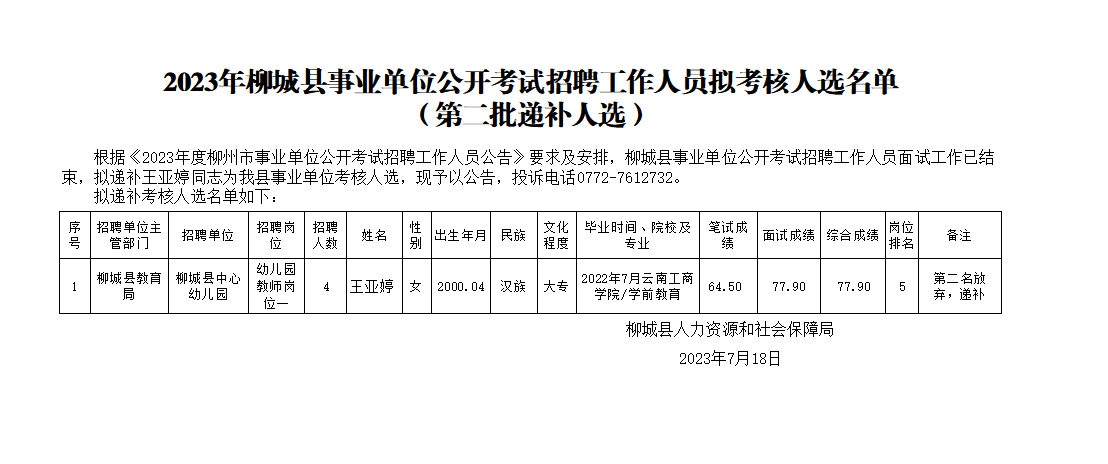 2023年柳城县事业单位公开考试招聘工作人员拟考核人选名单 (第二批递补人选)