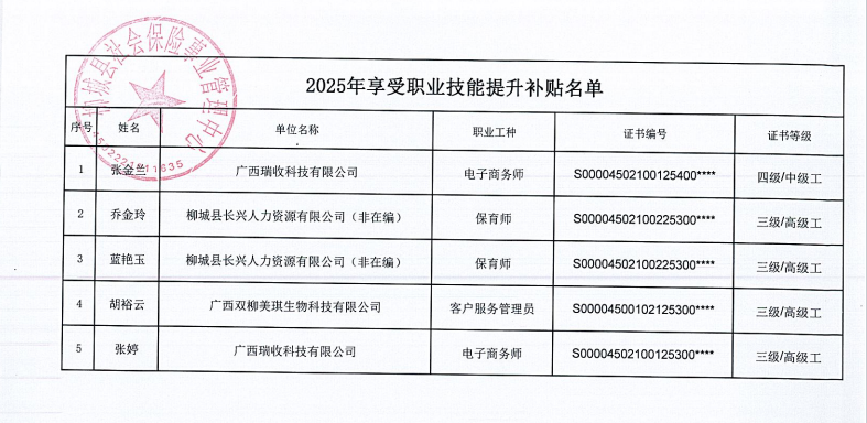 按照《广西壮族自治区人力资源和社会保障厅财政厅关于印发失业保险支持参保职工提升职业技能补贴暂行办法的通知》(桂人社发〔2017〕44号)、《广西壮族自治区人力资源和社会保障厅 广西壮族自治区财政厅 国家税务总局广西壮族自治区税务局关于延续实施失业保险稳岗惠民政策措施的通知》(桂人社发﹝2025﹞19 号)文件精神,经个人申报,我中心审核,以下人员符合失业保险支持参保职工提升职业技能补贴发放条件,现予公示,公示期为7天,即从2025年11月13日至2025年11月19日,公示期间,如有异议,请与柳城县社会保险事业管理中心联系,联系电话:0772-7614291。