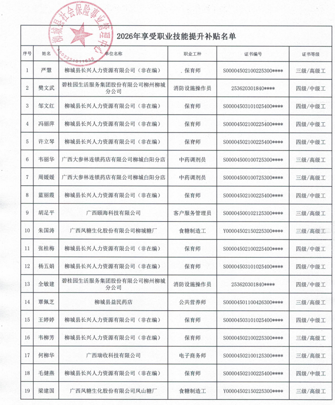 按照《广西壮族自治区人力资源和社会保障厅财政厅关于印发失业保险支持参保职工提升职业技能补贴暂行办法的通知》(桂人社发〔2017〕44号)文件精神,经个人申报,我中心审核,以下人员符合失业保险支持参保职工提升职业技能补贴发放条件,现予公示,公示期为7天,即从2026年1月13日至2026年1月19日,公示期间,如有异议,请与柳城县社会保险事业管理中心联系,联系电话:0772-7614291。