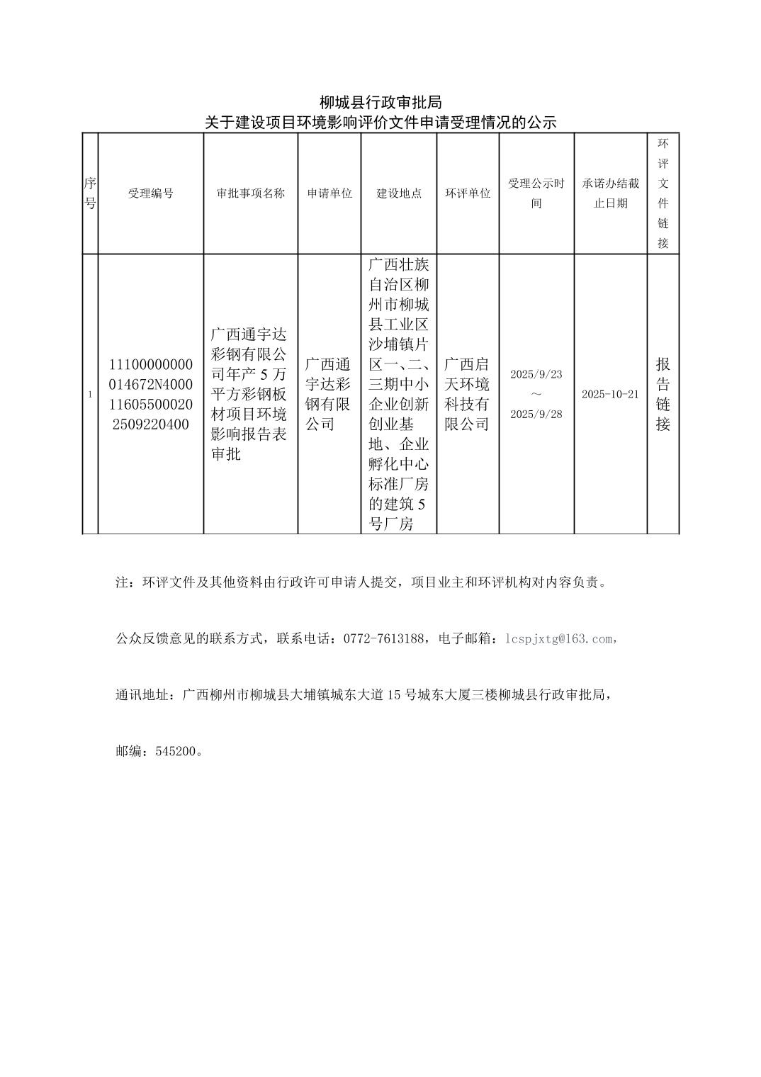 2025年9月23日柳城县行政审批局关于建设项目环境影响评价文件申请受理情况的公示