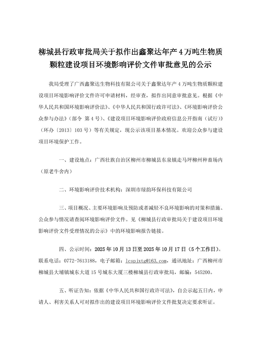 柳城县行政审批局关于拟作出鑫聚达年产4万吨生物质颗粒建设项目环境影响评价文件审批意见的公示