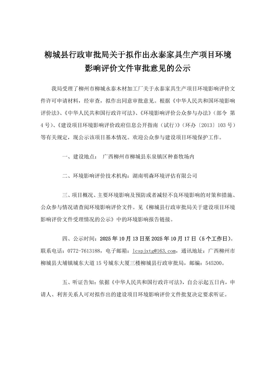 柳城县行政审批局关于拟作出永泰家具生产项目环境影响评价文件审批意见的公示