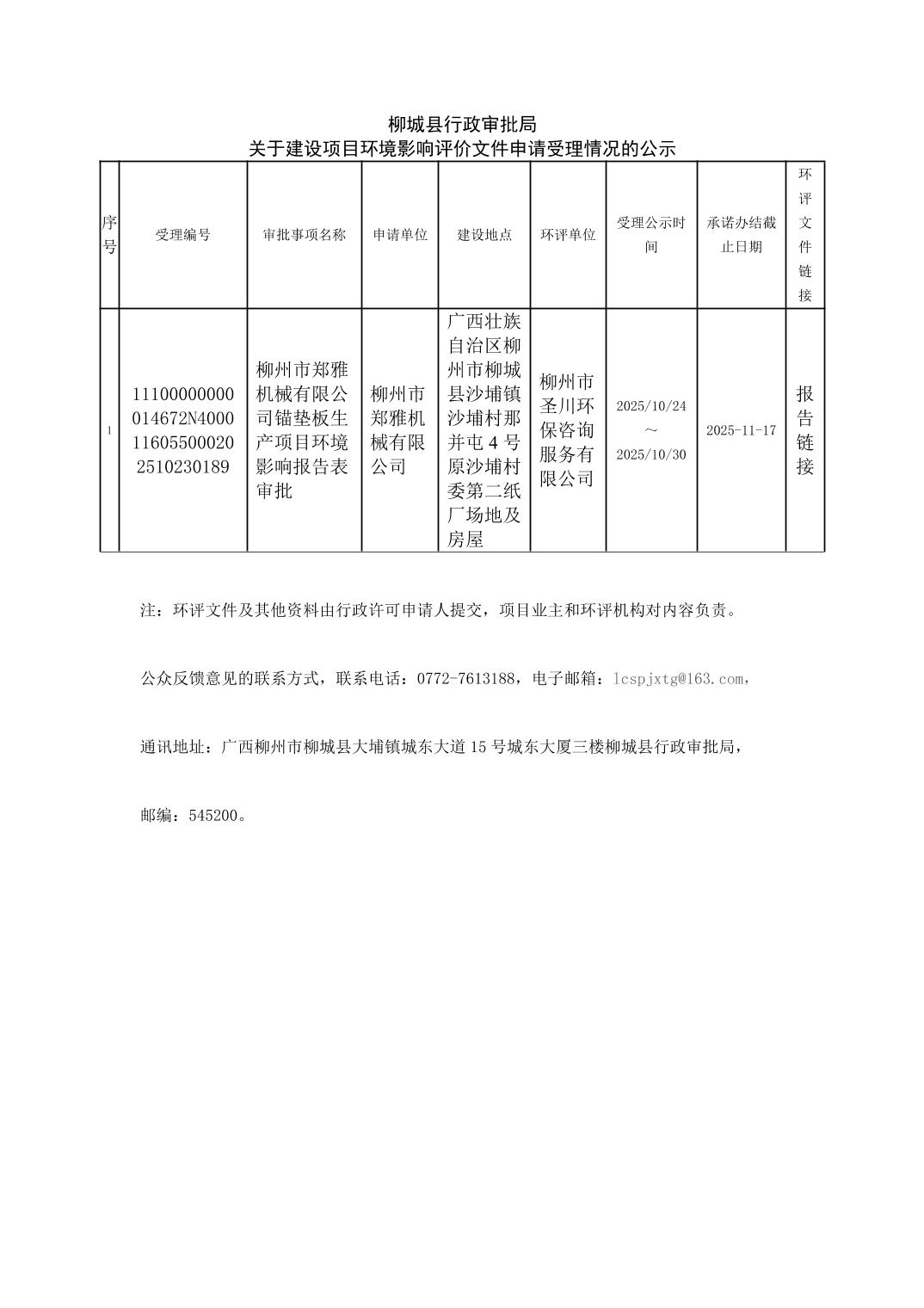 2025年10月24日柳城县行政审批局关于建设项目环境影响评价文件申请受理情况的公示