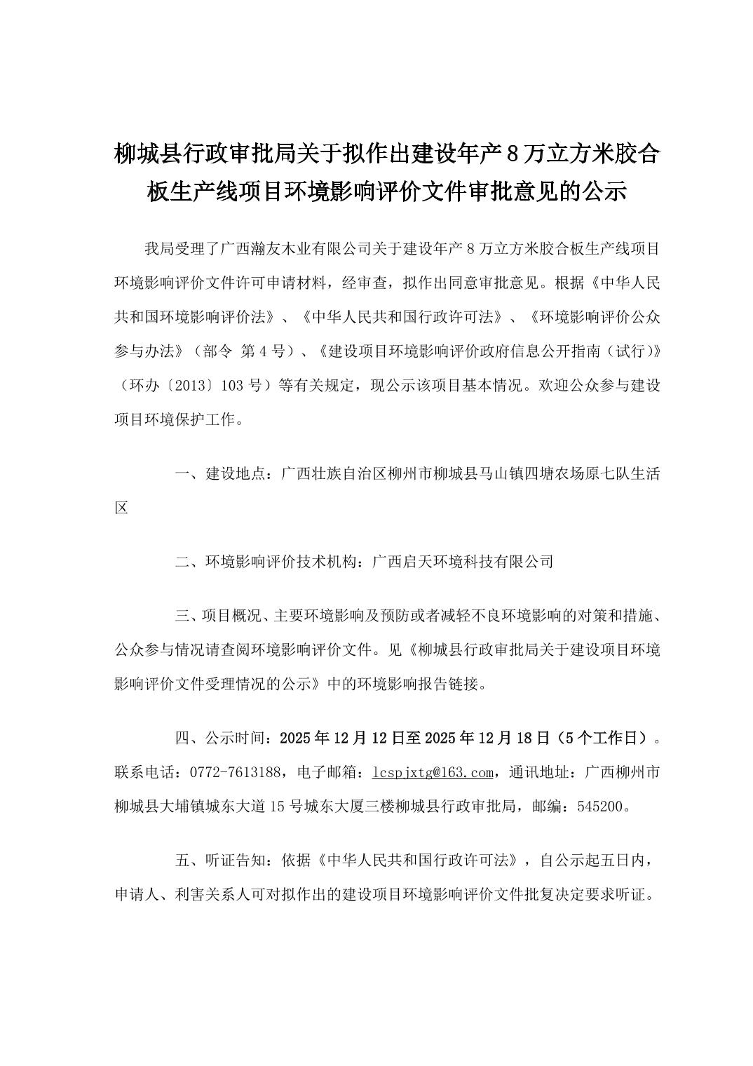 柳城县行政审批局关于拟作出建设年产8万立方米胶合板生产线项目环境影响评价文件审批意见的公示