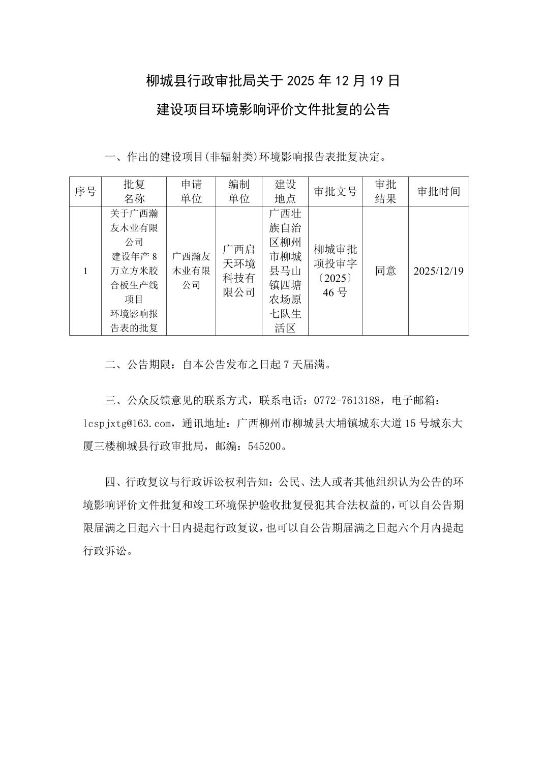 柳城县行政审批局关于2025年12月19日建设项目环境影响评价文件批复的公告