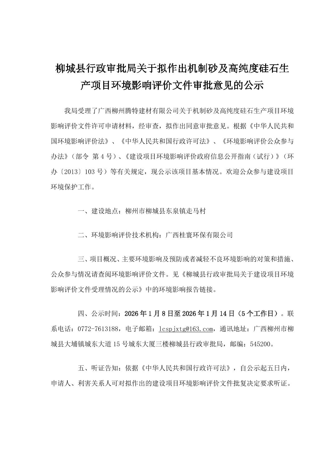 柳城县行政审批局关于拟作出机制砂及高纯度硅石生产项目环境影响评价文件审批意见的公示