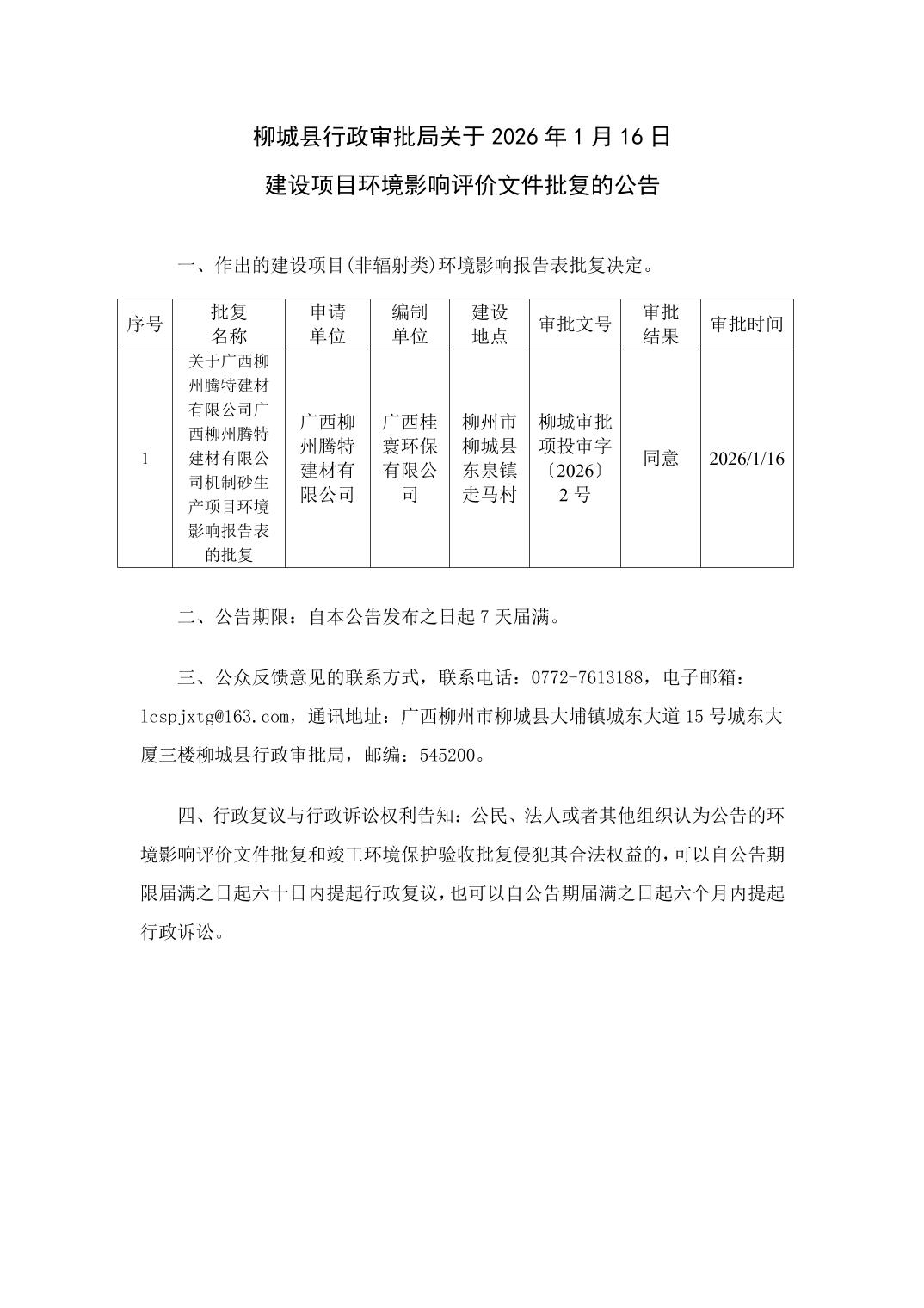 柳城县行政审批局关于2026年1月16日建设项目环境影响评价文件批复的公告