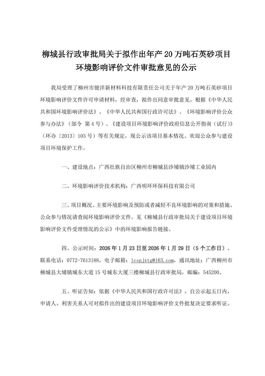柳城县行政审批局关于拟作出年产20万吨石英砂项目环境影响评价文件审批意见的公示