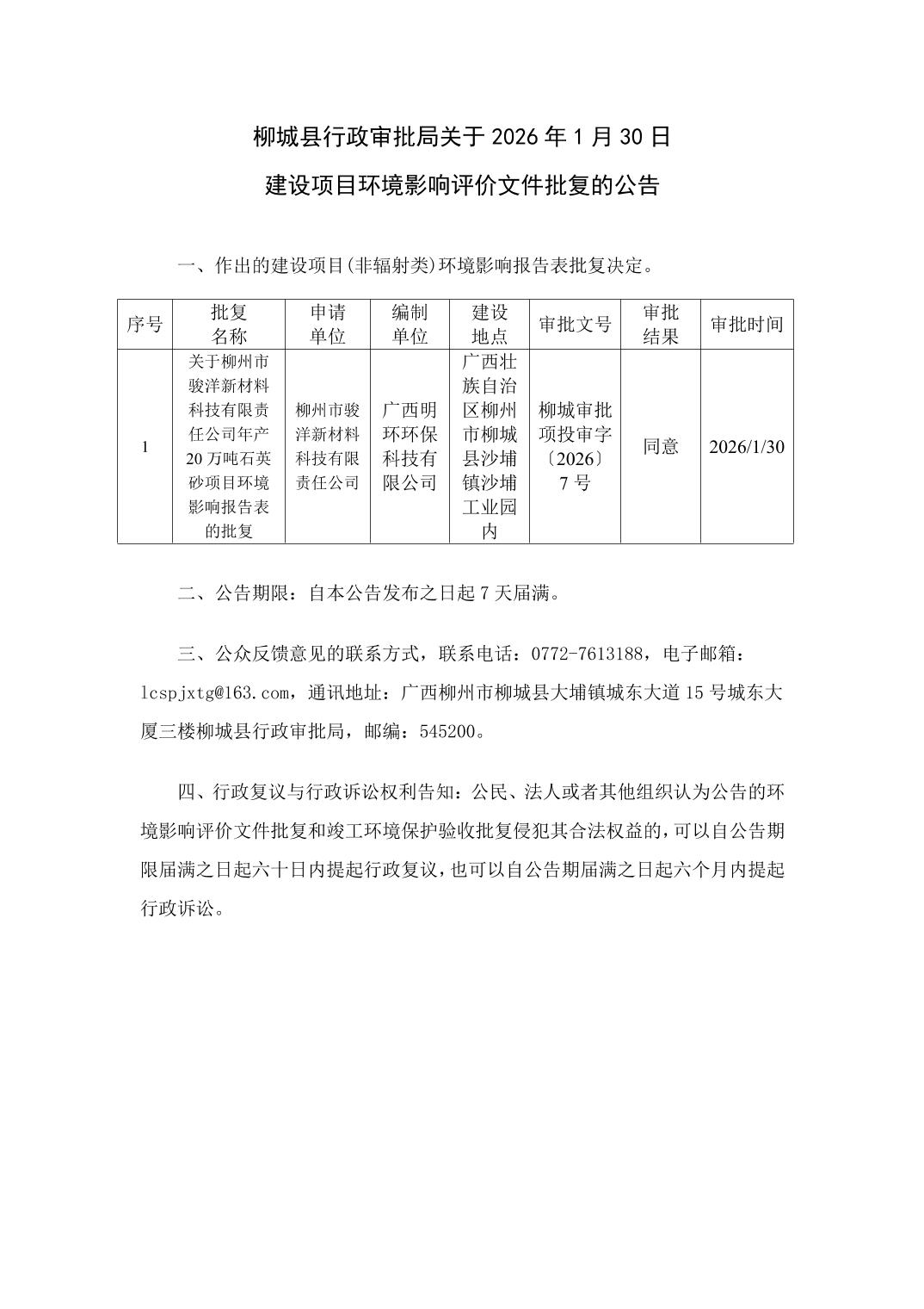 〔2026〕7号-关于柳州市骏洋新材料科技有限责任公司年产20万吨石英砂项目环境影响报告表的批复.docx