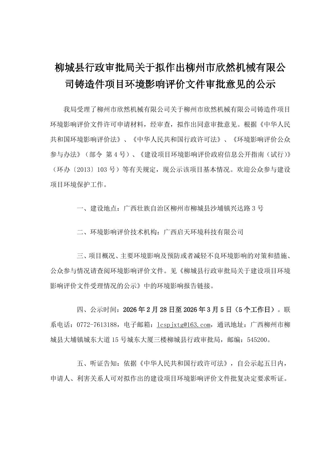 柳城县行政审批局关于2026年3月2日建设项目环境影响评价文件批复的公告
