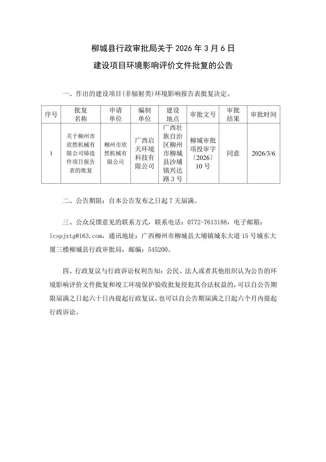 柳城县行政审批局关于2026年3月6日建设项目环境影响评价文件批复的公告