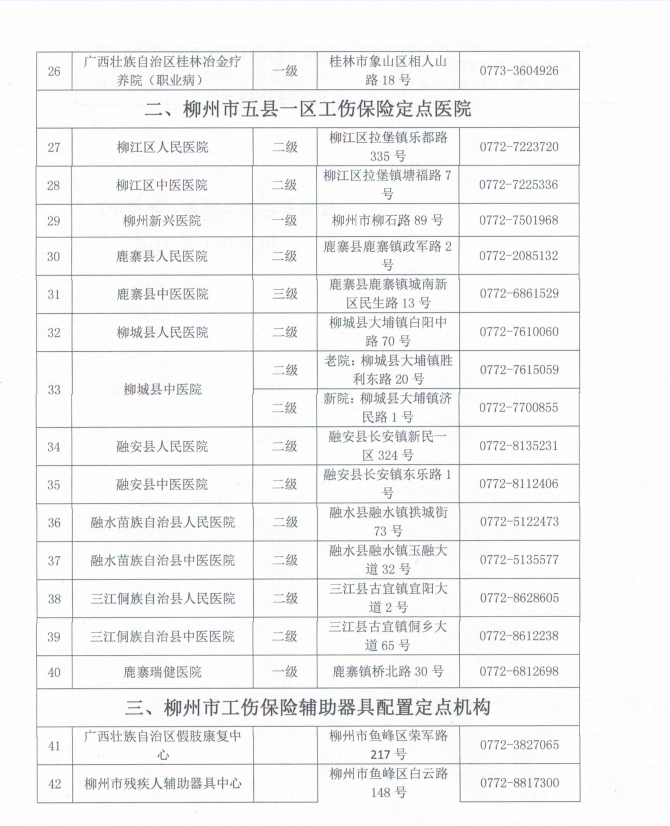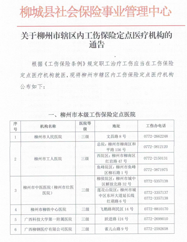 关于柳州市辖区内工伤保险定点医疗机构的通告