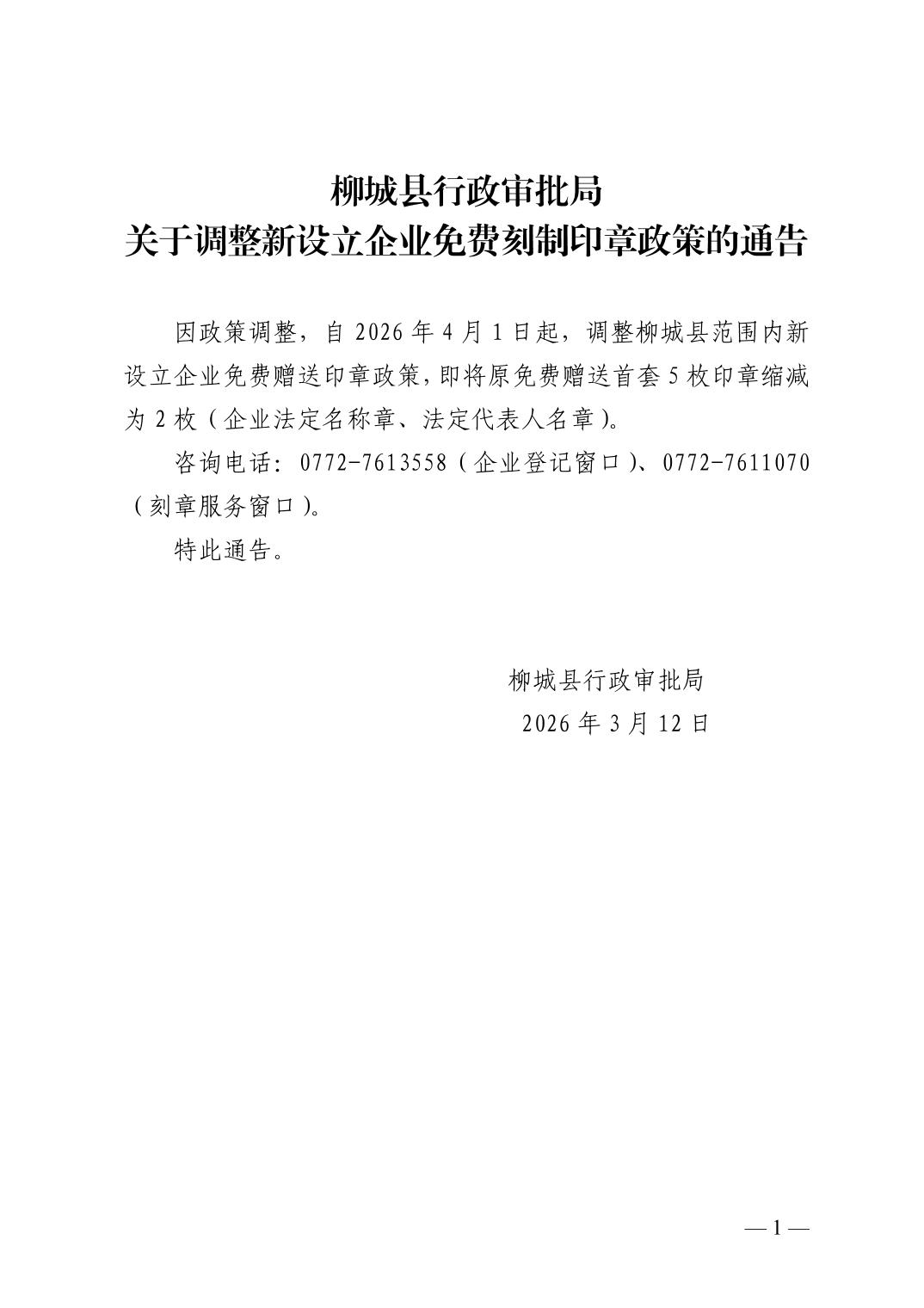 柳城县行政审批局关于调整新设立企业免费刻制印章政策的通告