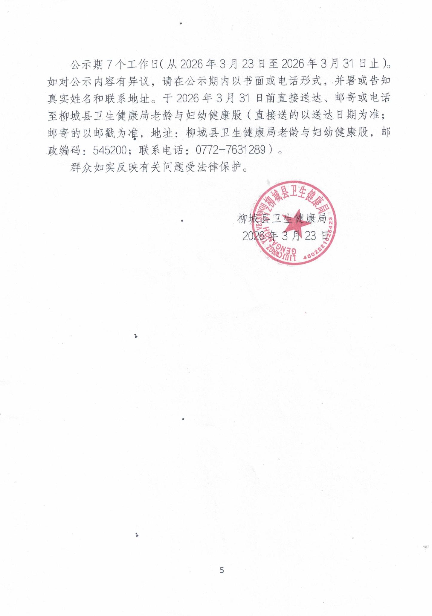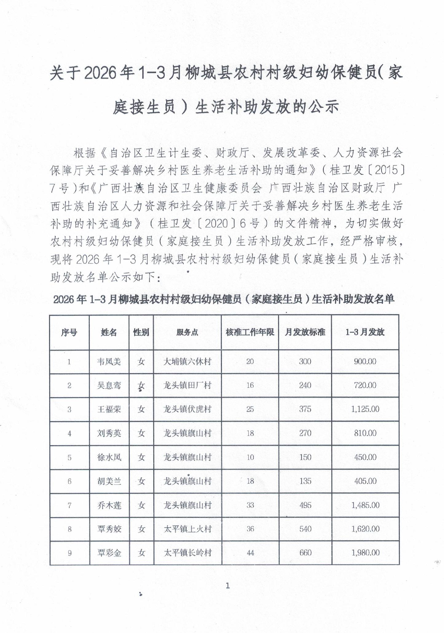关于2026年1-3月柳城县农村村级妇幼保健员(家庭接生员)生活补助发放的公示
