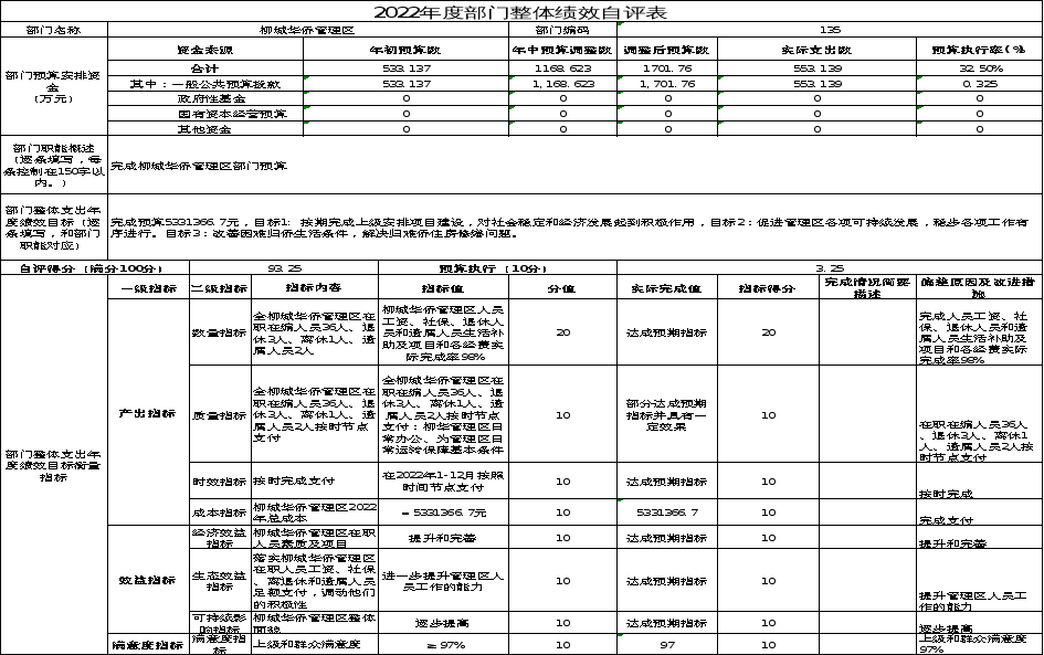 根据预算绩效管理要求,我部门组织对2022年度一般公共预算项目支出开展绩效自评,共涉及预算资金 1701.76万元,预算执行率32.5%,预算执行得分3.2分,整体自评得分93.25分,自评结论一等。