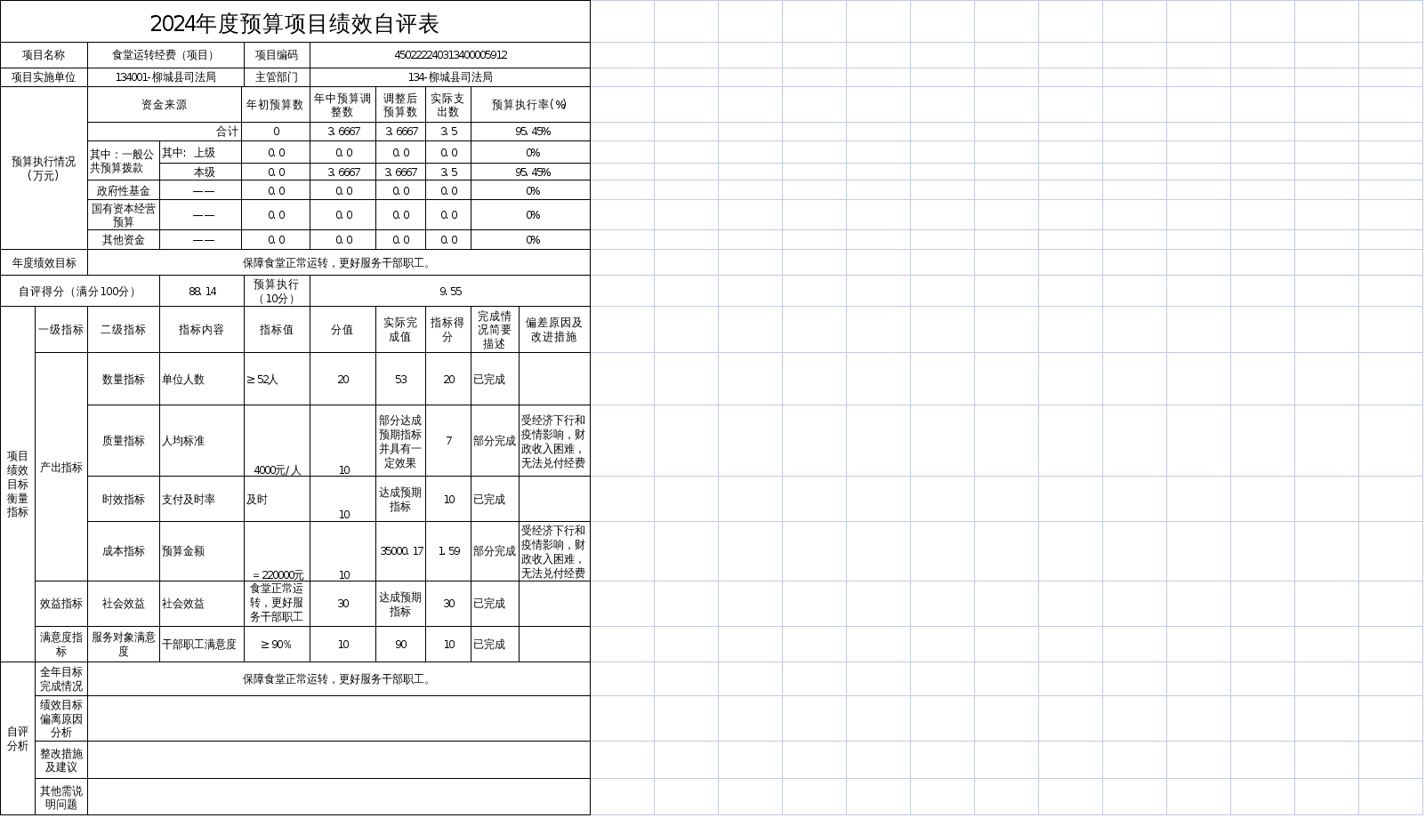 食堂运转经费(项目)项目自评综述:全年预算数3.67万元,执行数3.5万元,执行率为95.45%,自评得分为88.14分。项目绩效目标总体完成情况良好,按时做好项目资金支付,保障食堂正常运转,更好服务干部职工。发现的主要问题及原因是各项目目标任务基本完成,但是部分项目资金受经济下行及疫情影响,财政收入困难,未能及时拨付到位。下一步改进措施:积极与财政部门进行沟通,确保各项经费及时拨付。