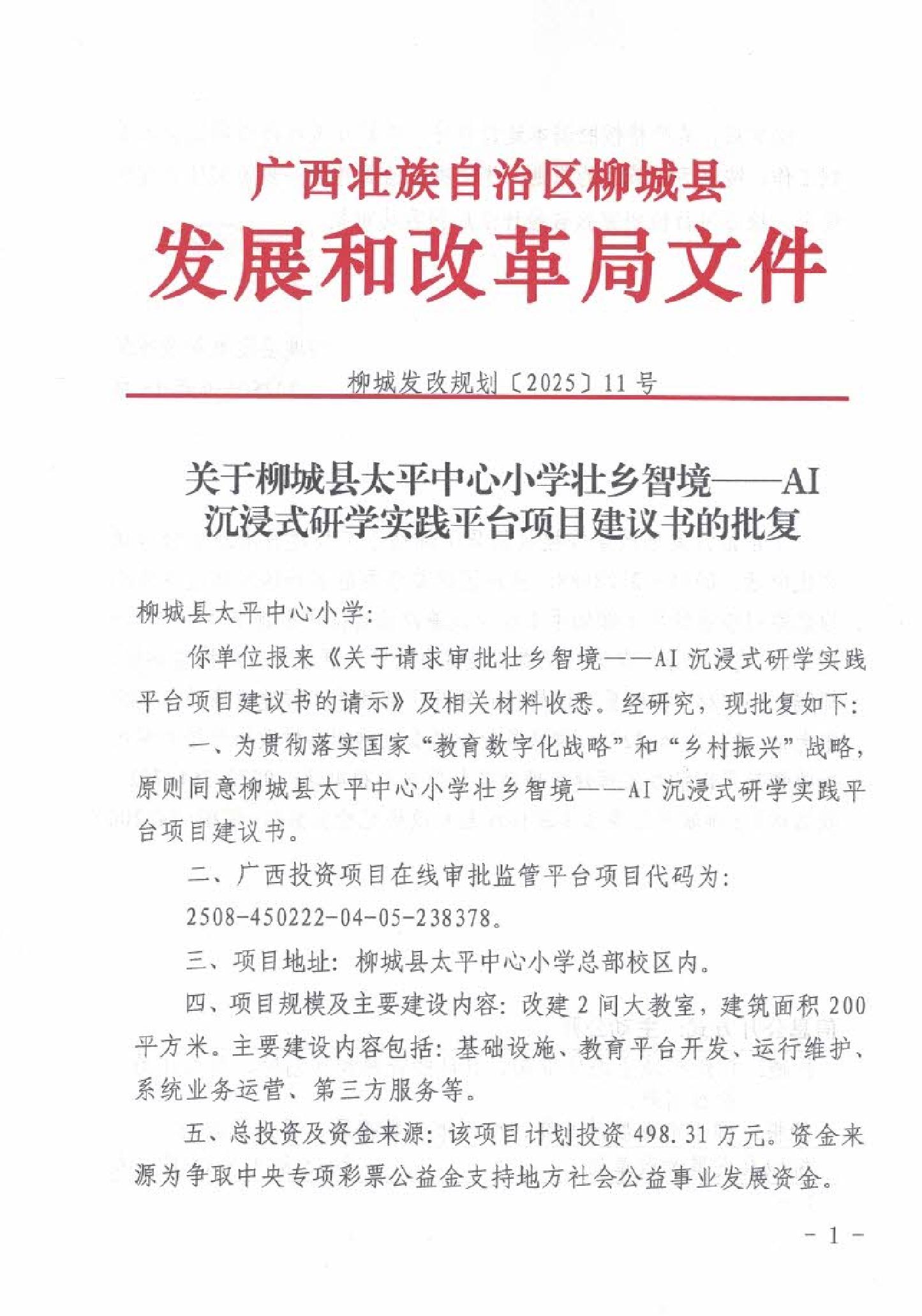 关于柳城县太平中心小学壮乡智境——AI沉浸式研学实践平台项目建议书的批复