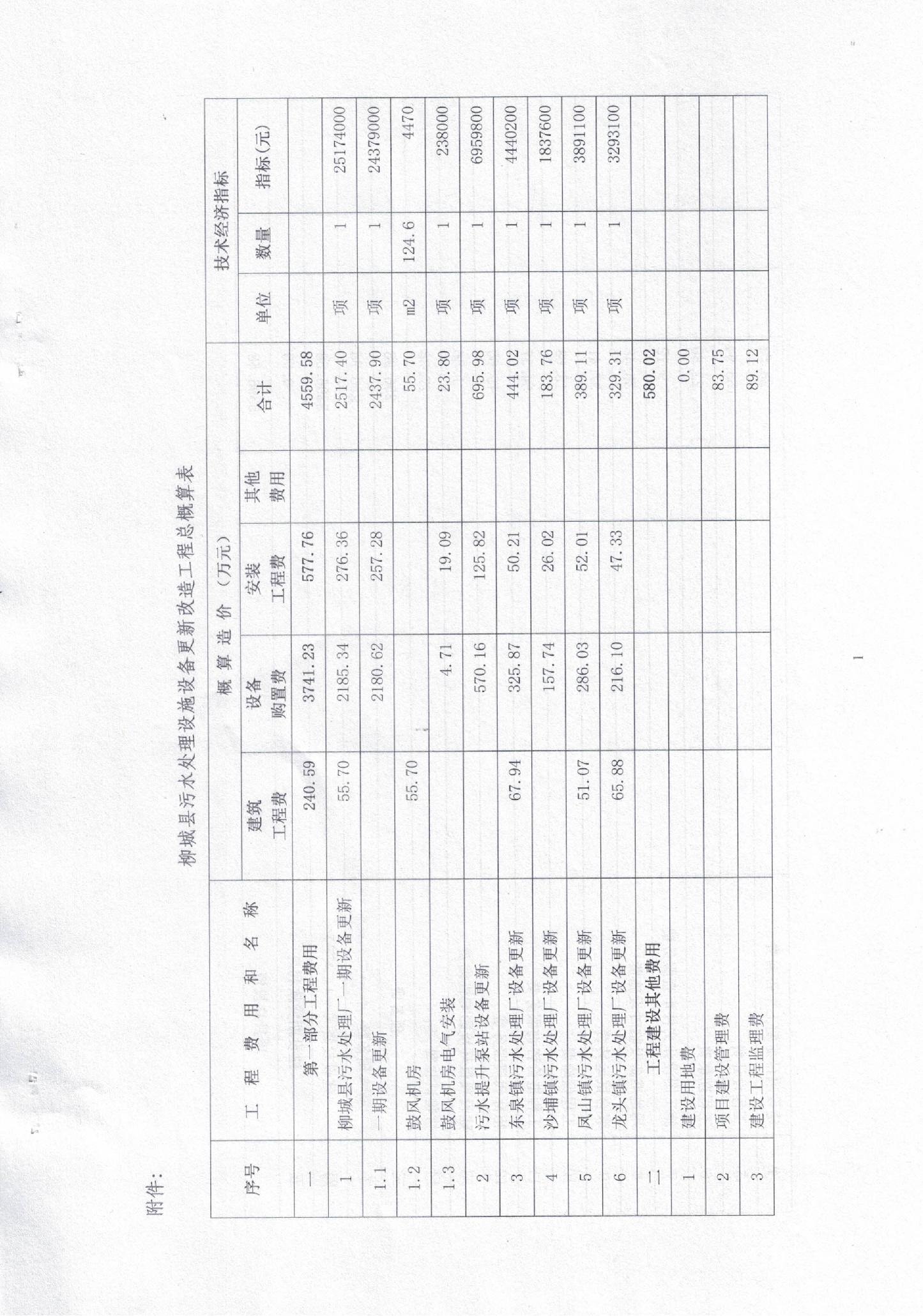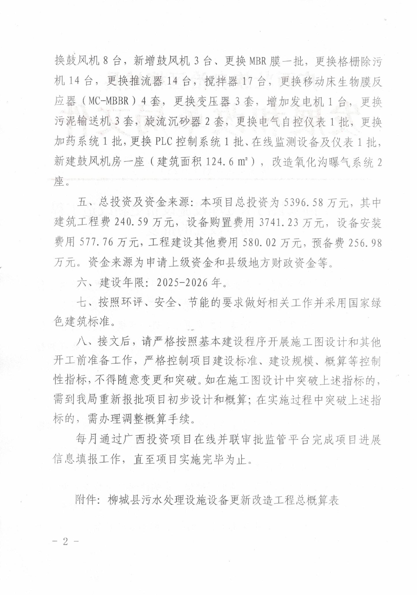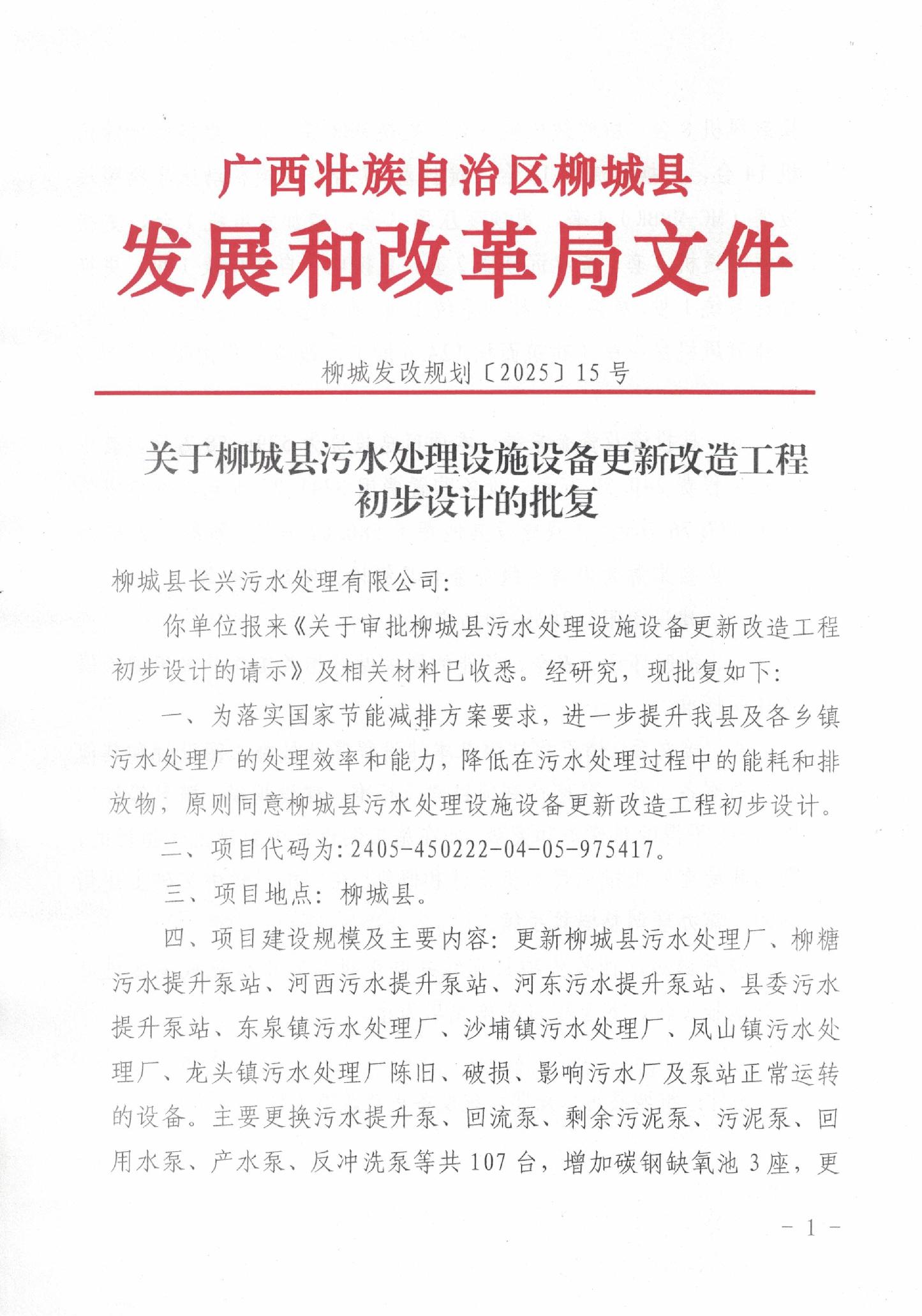 关于柳城县污水处理设施设备更新改造工程初步设计的批复